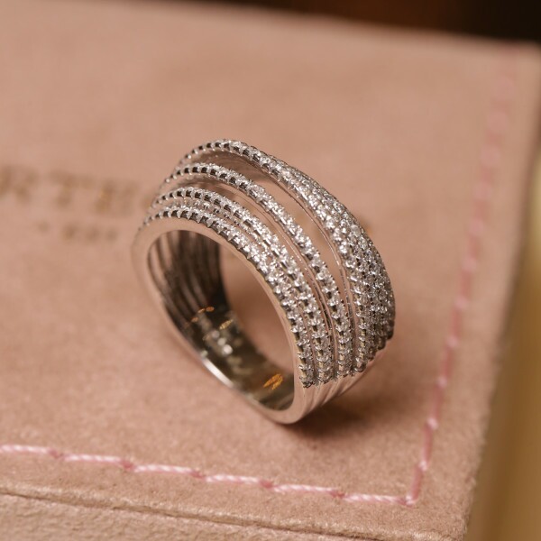 Anel Largo Fios Cravejado Com Zircônias Em Prata