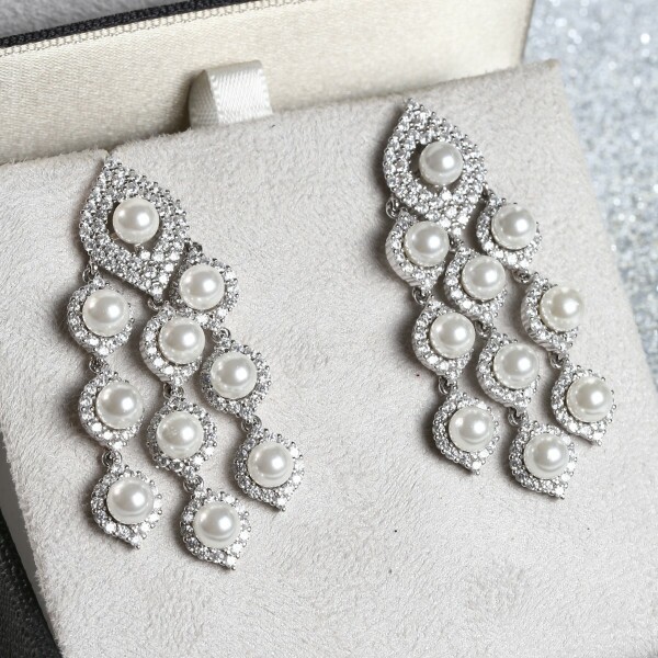 Brinco Navetes Com Zircônias E Perolas Penduradas Em Prata