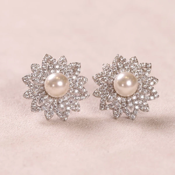 Brinco Flor Cravejada Com Zircônias e Pérolas Em Prata
