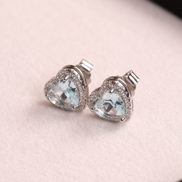 Brinco Coração Cravejado Com Zircônias Água-Marinhas Em Prata