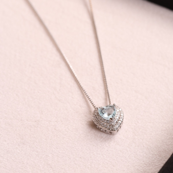 Gargantinha Coração Cravejado Com Zircônias Água-Marinhas Em Prata