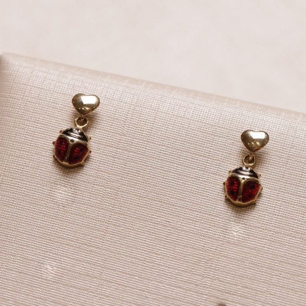 Brinco Coração Com Joaninha Resinada Em Ouro Amarelo