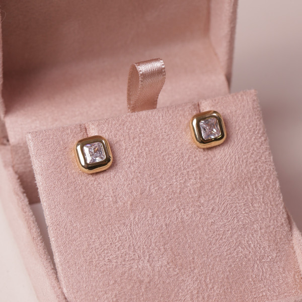 Brinco Quadrado Boleado Com Zircônias no Centro Em Ouro Amarelo